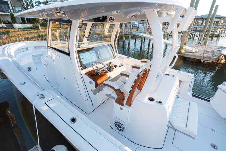 Sportsman included triple adjustable captain’s chairs at the helm and the console has a wrap-around tempered glass windshield with an actuated vent. The oversized fiberglass hard-top included two integrated Lumitec Razor lights and navigation lights.
