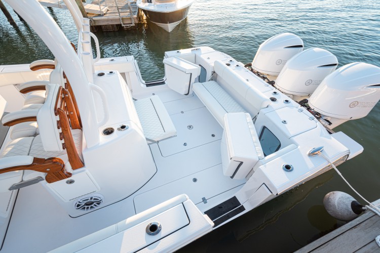 When it comes to fishing, stow away the bench seats and enjoy access to two 234-quart in-floor insulated fish boxes, twin 30-gallon pressurized aquarium live wells fed by twin pump sea chest and an 88-quart transom cooler. The boat reportedly has more than 50 square feet of open cockpit space for fishing.