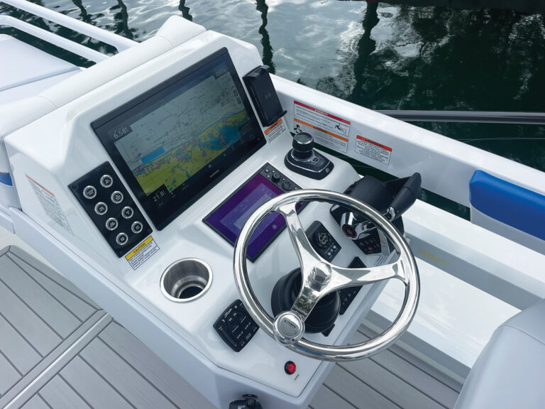 From the helm seats forward, the two models are almost identical. The centerline helm offers unimpeded visibility through a massive one-piece windshield that opens on electric rams. Three 22-inch Garmin touch screens adorn the dash, where you can monitor an almost countless number of screen variations for monitoring engine data, navigation, fishfinder, and live video via a FLIR camera.