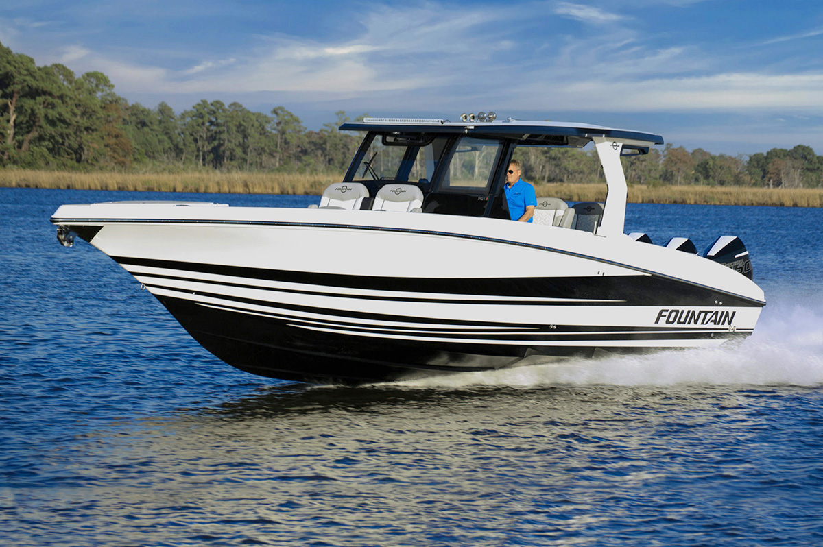 Fountain will offer the 38 SCX with Mercury Marine power from triple 300-hp outboards to quad Mercury Racing 450R outboards. With 900-hp on the transom, the 38-footer will run in the 70-mph range.