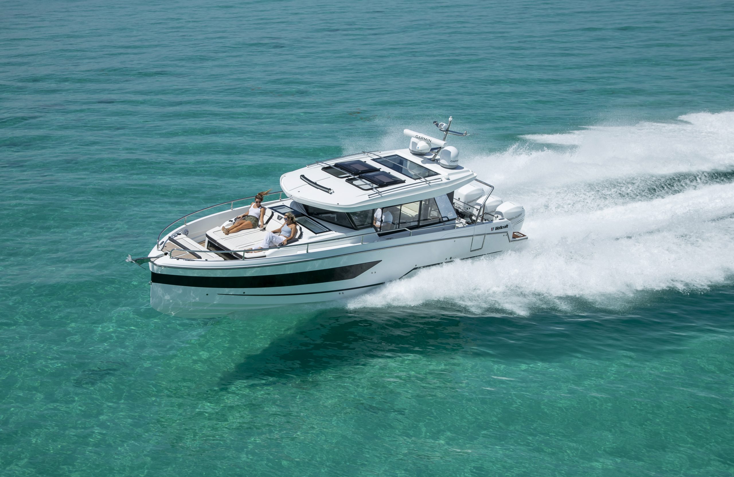An integrated fiberglass hardtop and windshield protects the helm. Electronic goodies include a Garmin digital switching system with touchscreen control. An optional Seakeeper 1 can be added for additional stability.