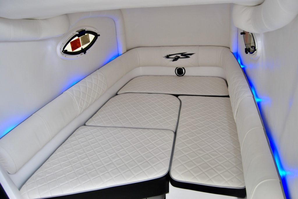 Stepping into the cabin there is a small galley and an area to rest that fits children or adults. Just in front of the console is a contoured lounge for two people and the bow has abundant seating with the U-shape lounge. An innovative table creates a lounging area in the bow.