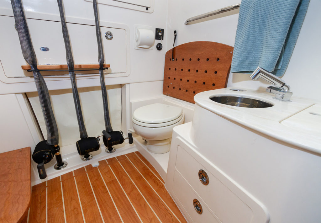 Grady-White won’t leave owners wanting for storage, designers tucked in room for six vertical rod holders, two drawers under the sink, aft storage with curtain cover and bulk storage under the berth. The North Carolina builder offers traditional options including a bow thruster, air conditioning, water heater, diesel generator and the Yamaha Helm Master.
