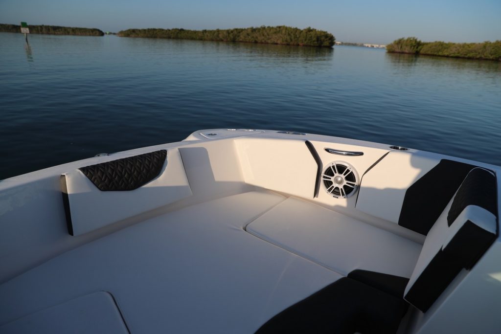 Offering one of the widest bows in the marine industry, the 240 CC features wraparound seating with removable cushions, two 110-quart stowage boxes and cupholders. Nearby is a front console seat that also includes a 20-gallon cooler.