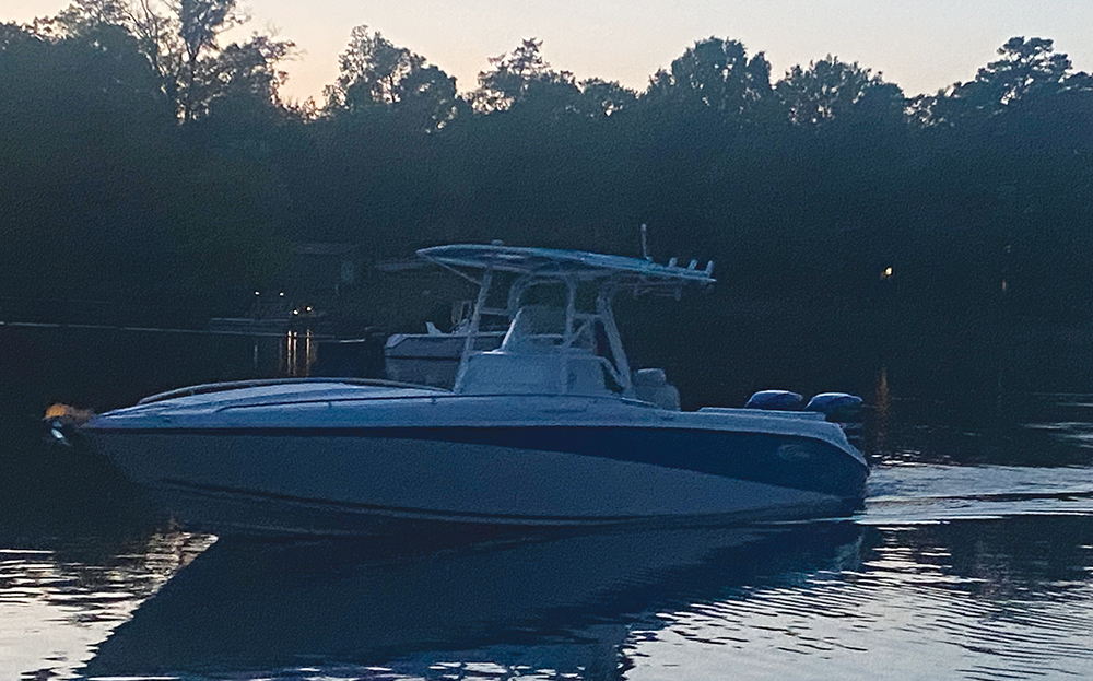 Sportsman included triple adjustable captain’s chairs at the helm and the console has a wrap-around tempered glass windshield with an actuated vent. The oversized fiberglass hard-top included two integrated Lumitec Razor lights and navigation lights.