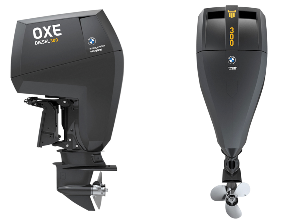 OXE Marine offers four models from 150 to 300 horsepower. The diesel OXE300 25-inch version weighs 947 pounds, while the comparable horsepower gasoline-fueled Mercury Verado 300 weighs 600 pounds.