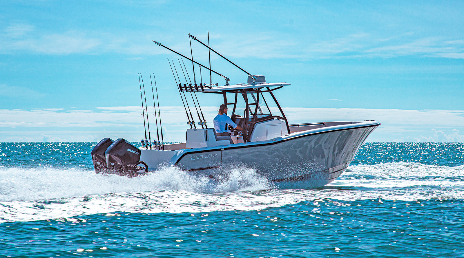 When Belzona set out to design the new 27 center console, the company wanted to strip down the existing 21.5-degree deadrise hull to just the essentials for a day of serious angling while keeping the soul of what makes Belzona boats great. Deck space was maximized, so was optional wrap-around seating, extra storage, and an extra fish box are placed at the bow. A fold-down transom bench and integrated cooler was added in the cockpit to complement the two fish boxes. There’s plenty of rod holders, a slide-out cooler and ample storage. Twin livewells are an option.