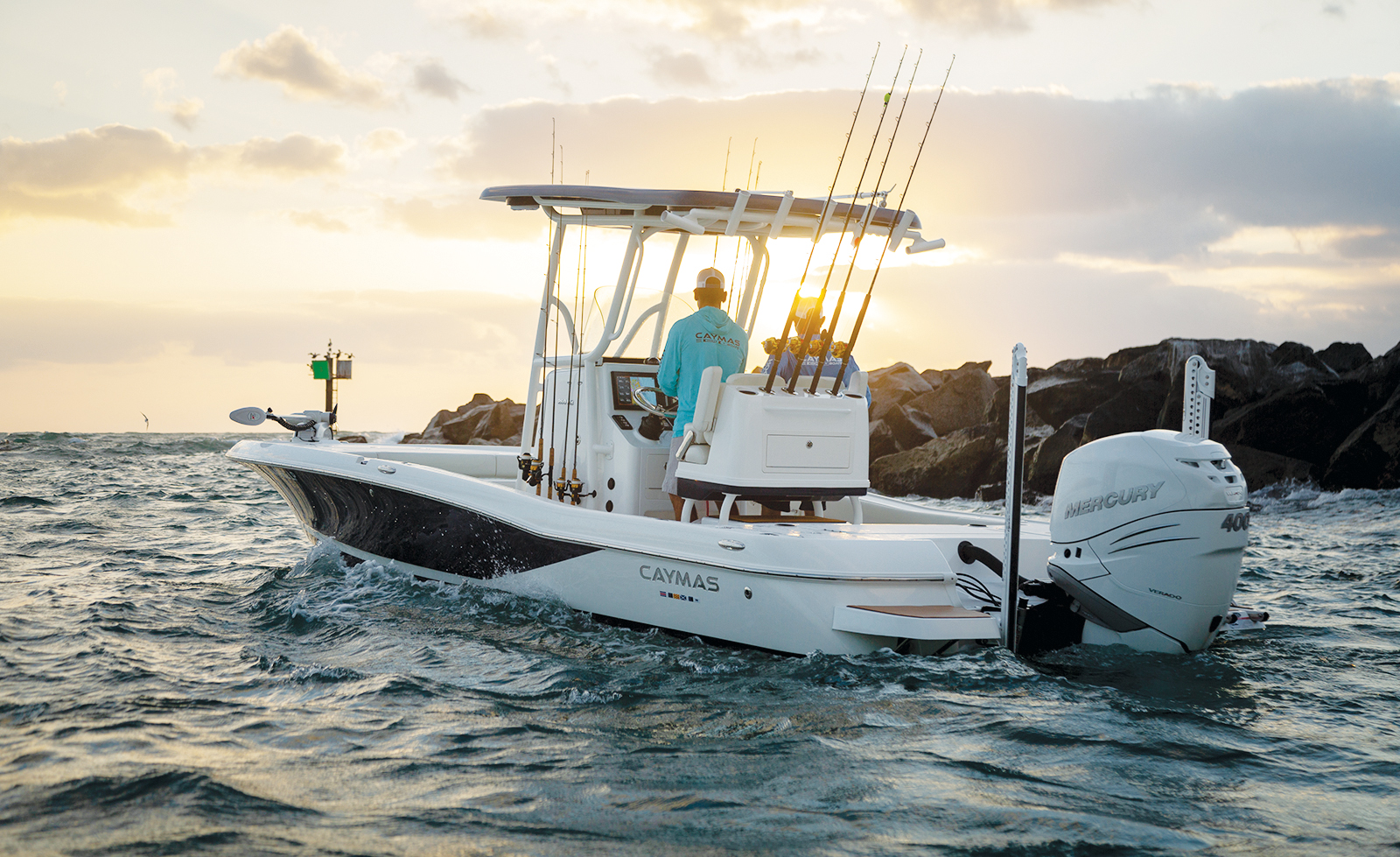 The new Caymas 28HB is a perfect combination or pro-level fishability, distinctive contemporary styling, and family-focused comfort. Performance starts with a Michael Peters Stepped-Vee Ventilated Tunnel. This patented hull delivers speed, fuel efficiency, and a precise and dry ride.