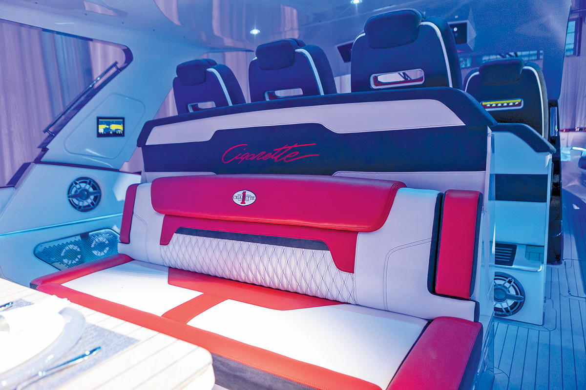 The helm is the lap of luxury on the 52 Thunder with seven shock-absorbing captain chairs that have power drop-out bottoms. The upholstery was done in-house and the iconic Cigarette Racing logo is featured prominently throughout the cockpit.